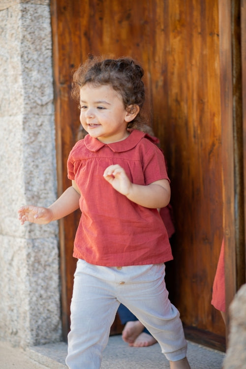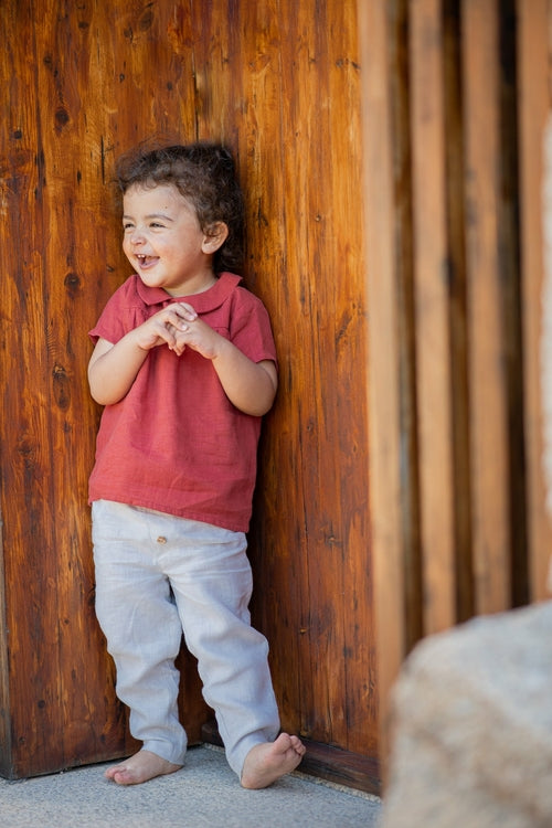 A lovely casual shirt with short sleeves, round collar, snaps closure on the back.